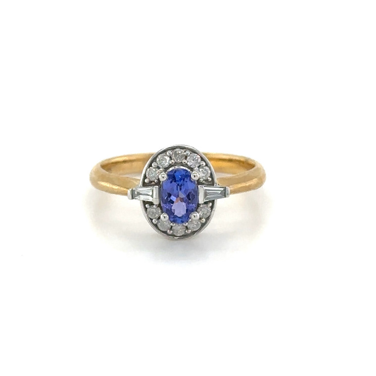 (MP5732) 9ct Yellow and White Gold Diamond and Tanzanite Ring. Claw Set oval tanzanite with baguette and round cut diamonds. Finger size O